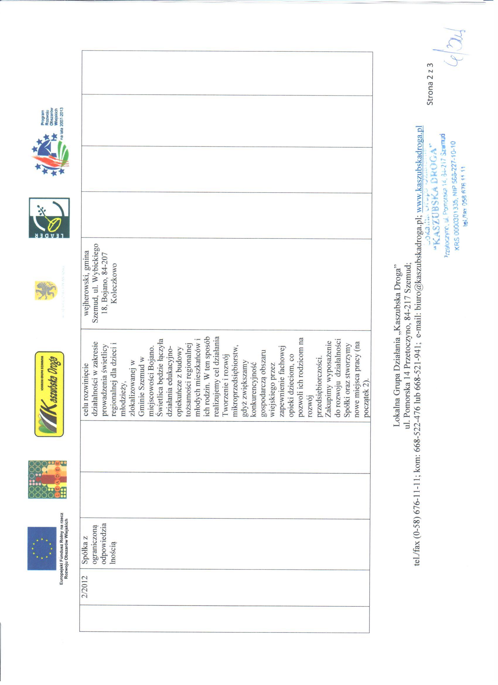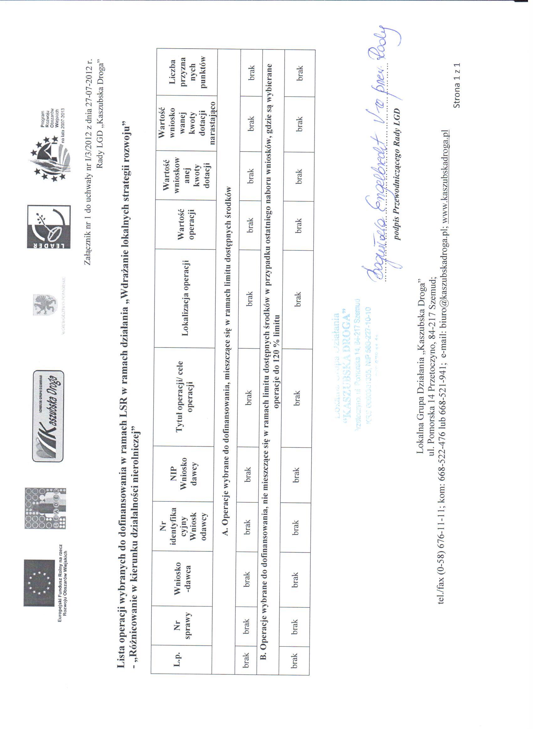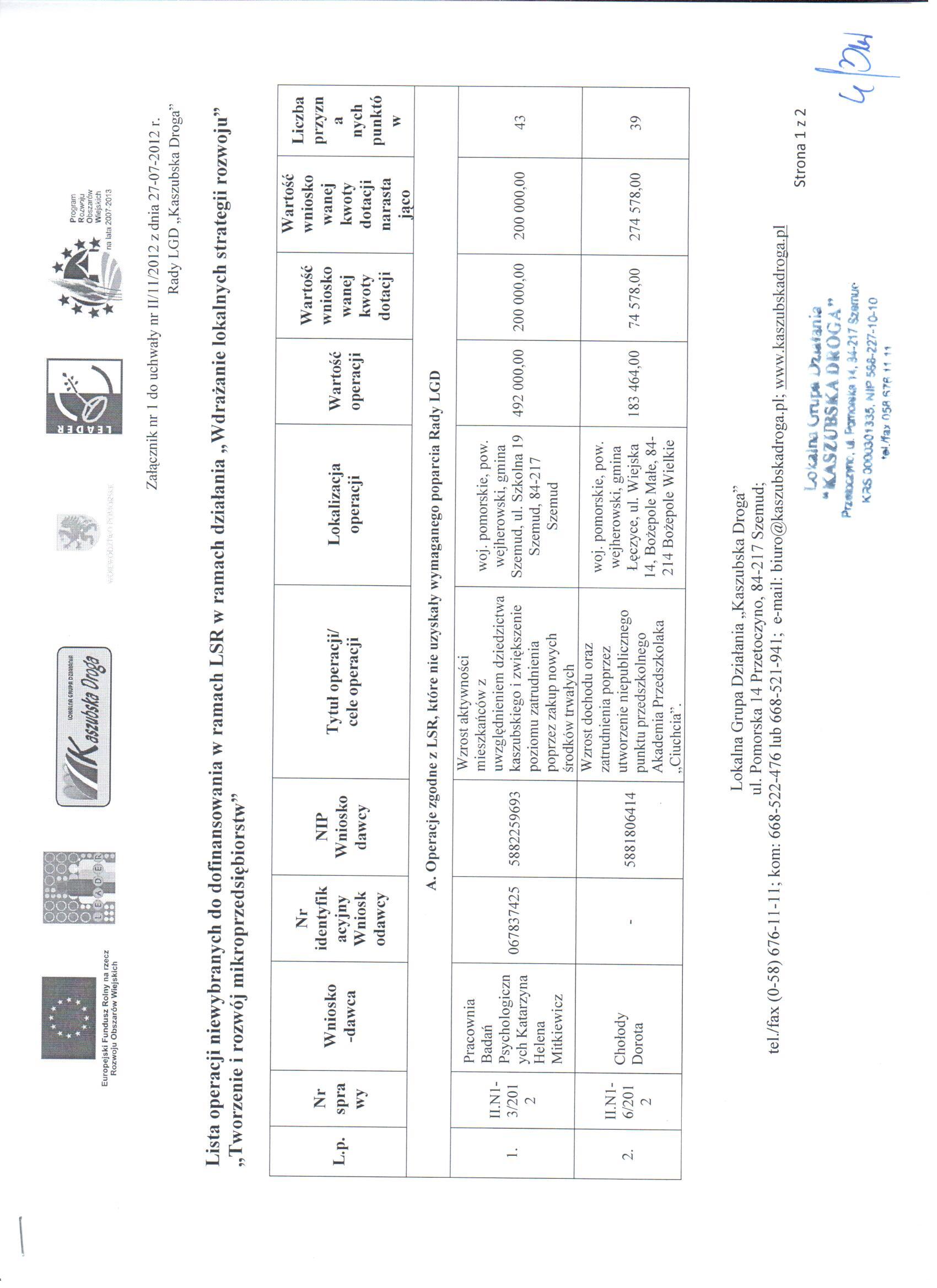 Dnia 27 lipca 2012r. Rada LGD "Kaszubska Droga" podjęła uchwałę w sprawie wybrania i niewybrania do dofinansowania projektów ocenionych w ramach naborów ogłoszonych w drugim kwartale 2012r. związanych z wdrażaniem Lokalnej Strategii Rozwoju dla działania "Tworzenie i rozwój mikroprzedsiębiorstw" oraz dla działania "Różnicowanie w kierunku działalności nierolniczej".