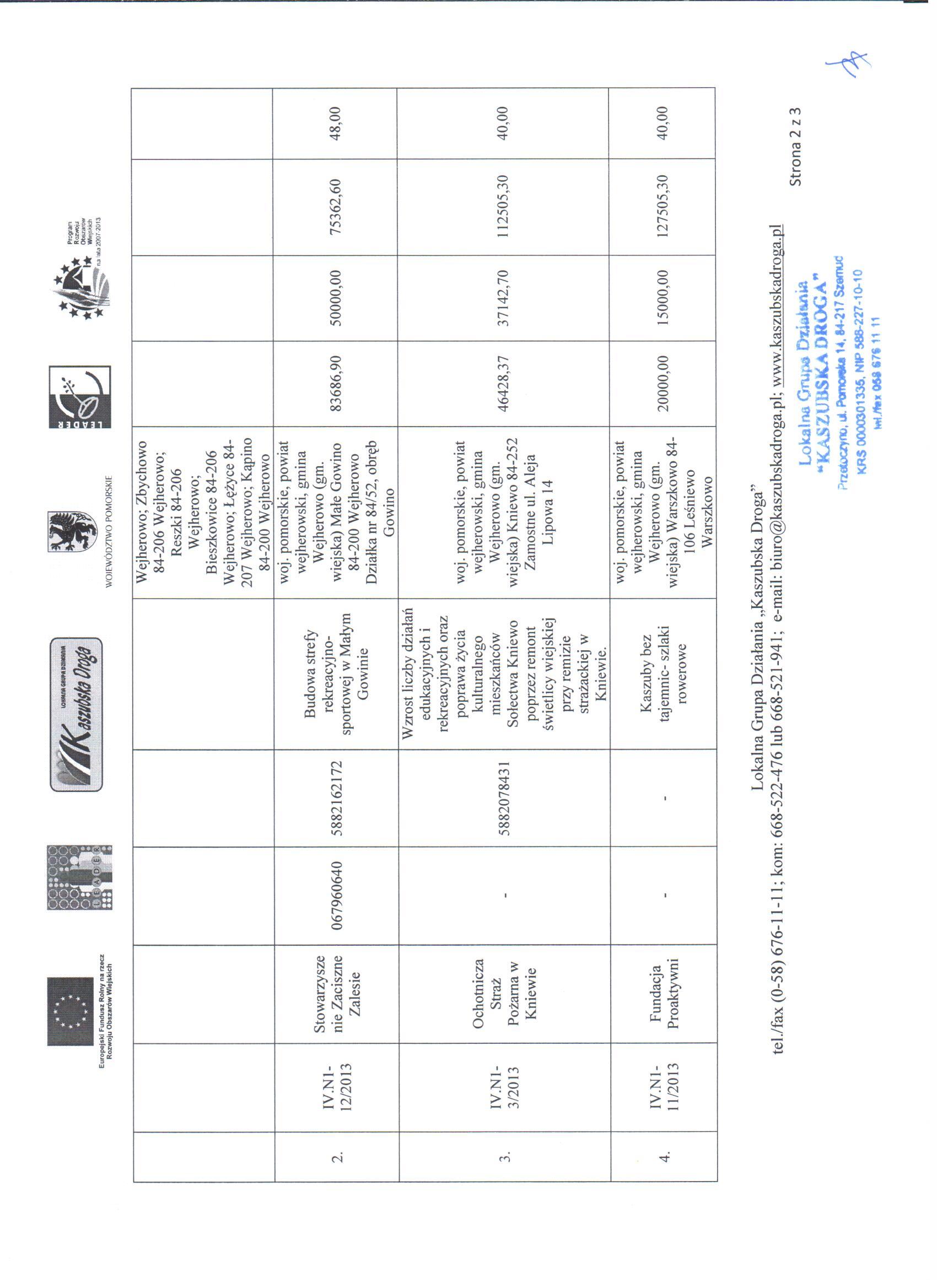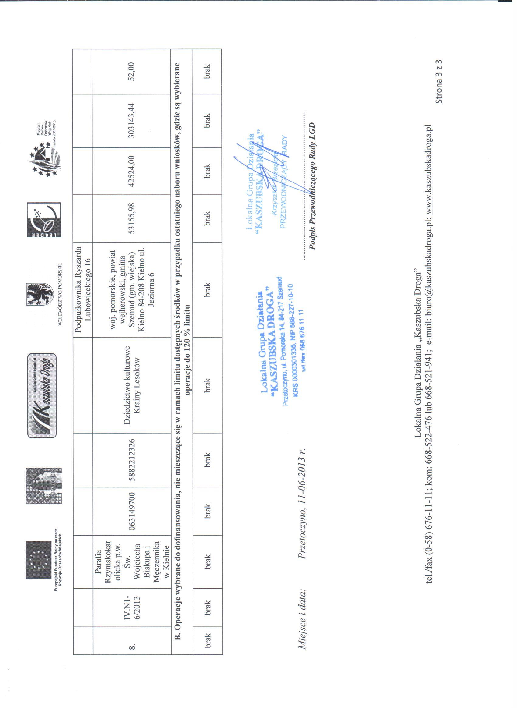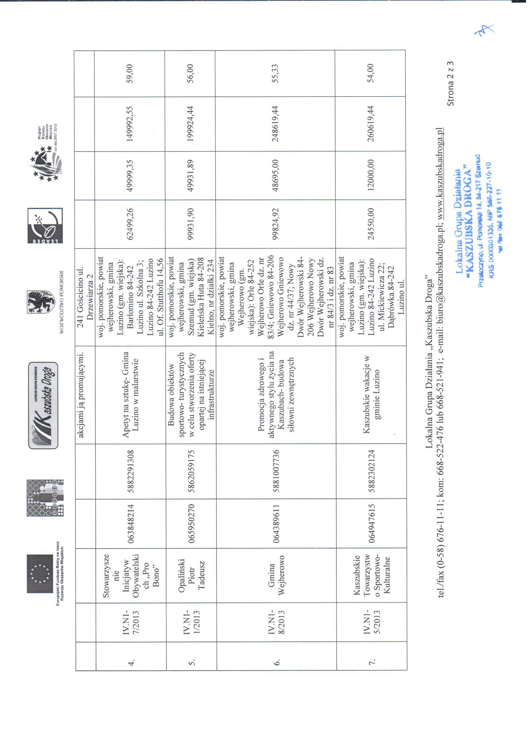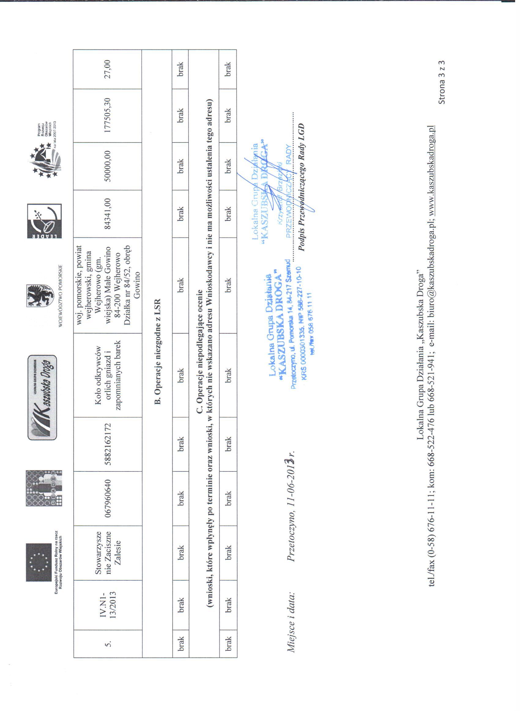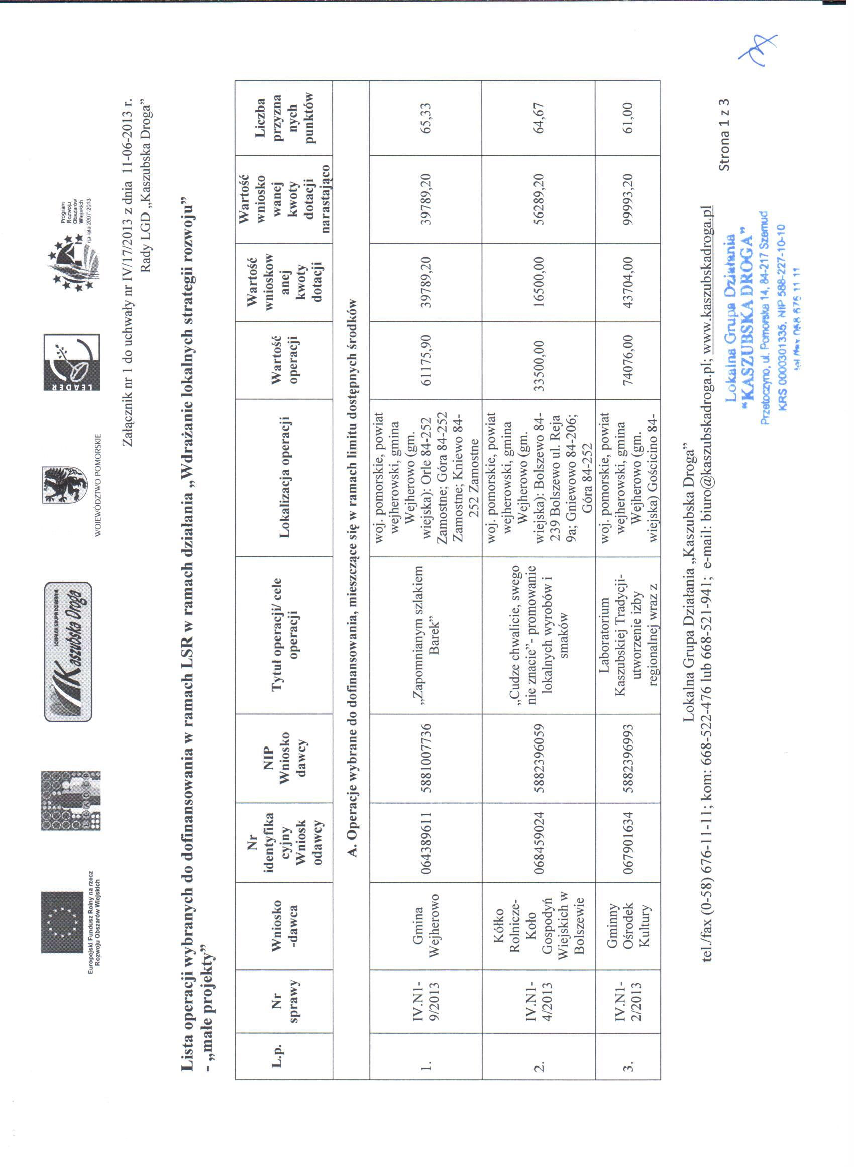 W dniu 11-06-2013 r. Rada Lokalnej Grupy Działania Kaszubska Droga” w drodze uchwał dokonała ostatecznego wyboru operacji wybranych i niewybranych do dofinansowania w ramach Lokalnej Strategii Rozwoju w ramach działania Wdrażanie Lokalnych Strategii Rozwoju w ramach naboru N1/2013 dla działania „małe projekty”. Ocena wniosków złożonych w odpowiedzi na konkurs ogłoszony w dniu 19-03-2013 r. , trwający w okresie od 02-04-2013 r. do 30-04-2013 r. przedstawia się następująco:
